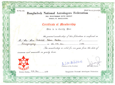 ১৯৮৮ সনে বাংলাদেশ ন্যাশনাল এস্ট্রলজার্স ফেডারেশনের মেম্বারশীপ সার্টিফিকেট।